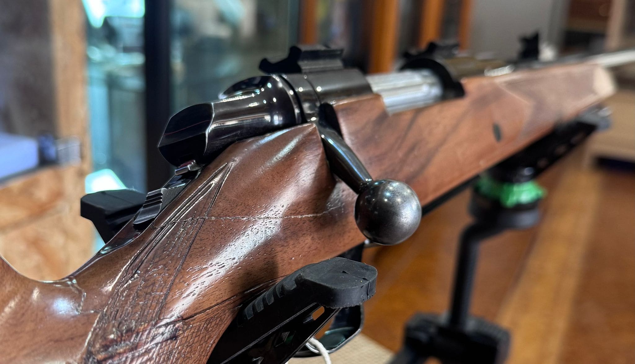 La culata de madera ha sido reparada en armería, manteniendo su funcionalidad y ofreciendo una solución fiable para seguir disfrutando del rifle con total seguridad. La reparación está realizada por profesionales y el arma se entrega con garantía de armería.